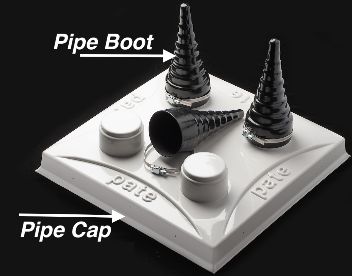 Pipe Cap Package (PCP) – An all-in-one, ready-to-install unit that includes watertight boots graduated to accommodate standard pipe sizes, adjustable stainless-steel pipe clamps, and a thermoplastic cover with scored sleeves for multiple pipes.